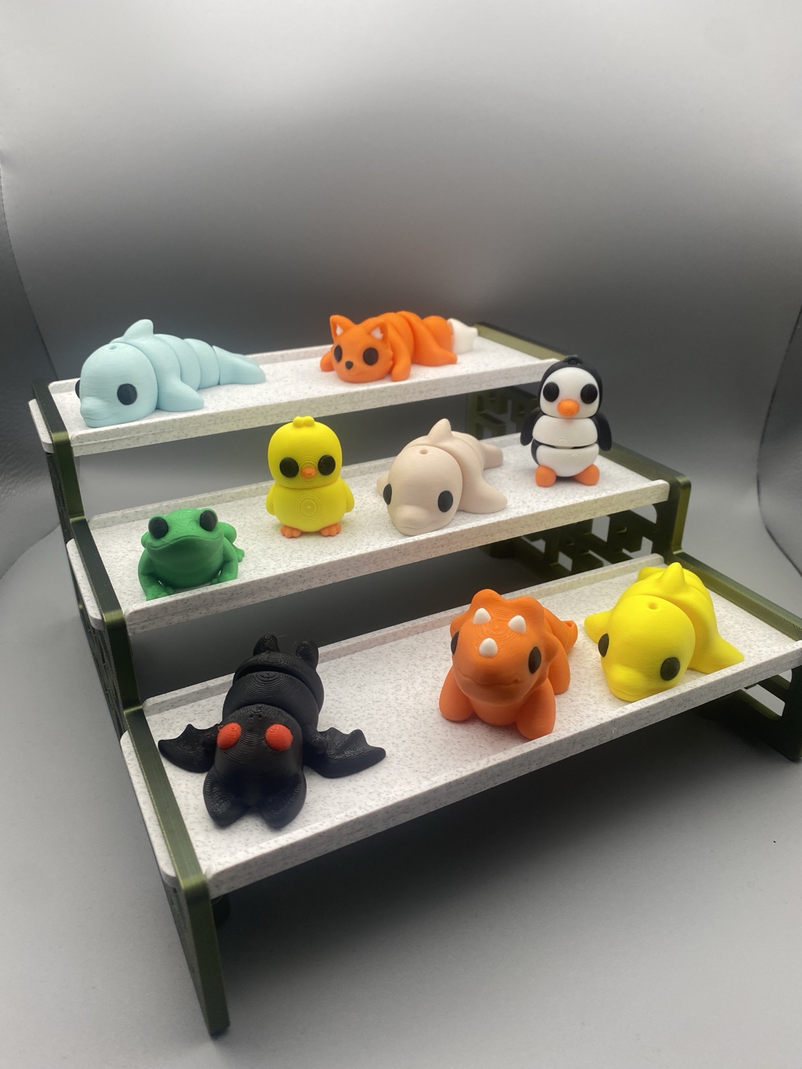 Delfin Hellblau, Delfin Gelb, Delfin Rosa, Schildkröte, Fuchs, Panda, Kücken, Fledermaus, Dino, Pinguin, Frosch
